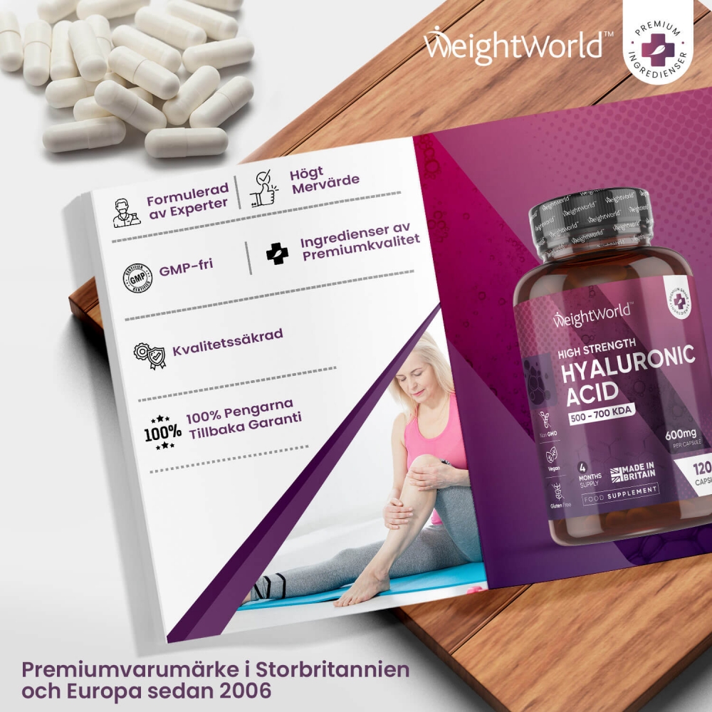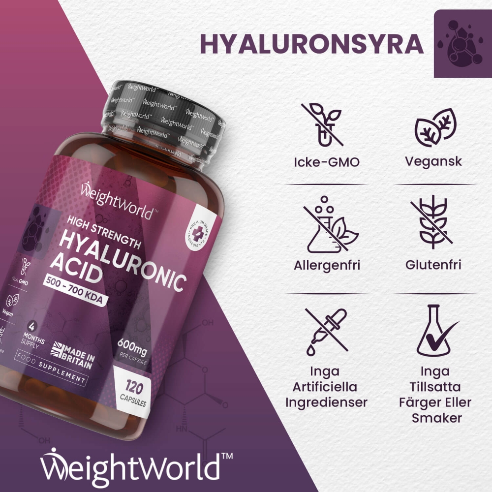WeightWorlds Hyaluronsyra kapslar är gjorda på helt naturliga ingredienser och är framställda för att stödja dina leder, ben och din hud från insidan.Detta då den innehåller en hög daglig dos på 600 mg Hyaluronsyra och är enkelt att ta. Detta gör att kapslarna har skapats för att hjälpa dig att tackla ålderstecken som kan bero på den minskade naturliga produktionen av hyaluronsyra i kroppen, vilket därför kan hjälpa till att göra din kropp rörligare och att hålla huden fräsch, jämn och ungdomlig.