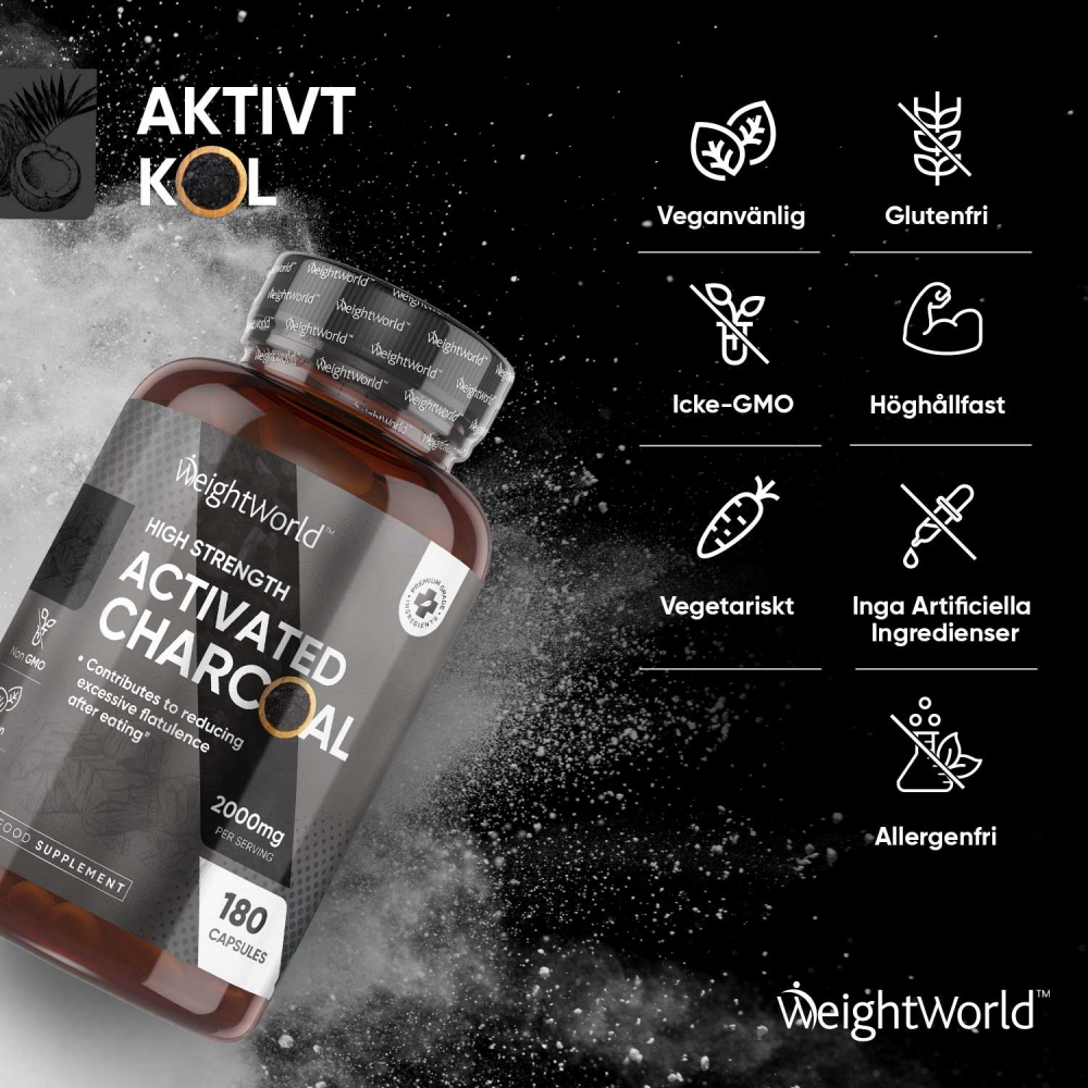 Vi rekommenderar att du tar 3 aktivt kol kapslar 30 minuter före en huvudmåltid 2 gånger om dagen med ett stort glas vatten. Tre kapslar av detta tillskott innehåller 1000 mg aktivt kol, och en daglig dos ger dig alltså 2000 mg aktivt kol.