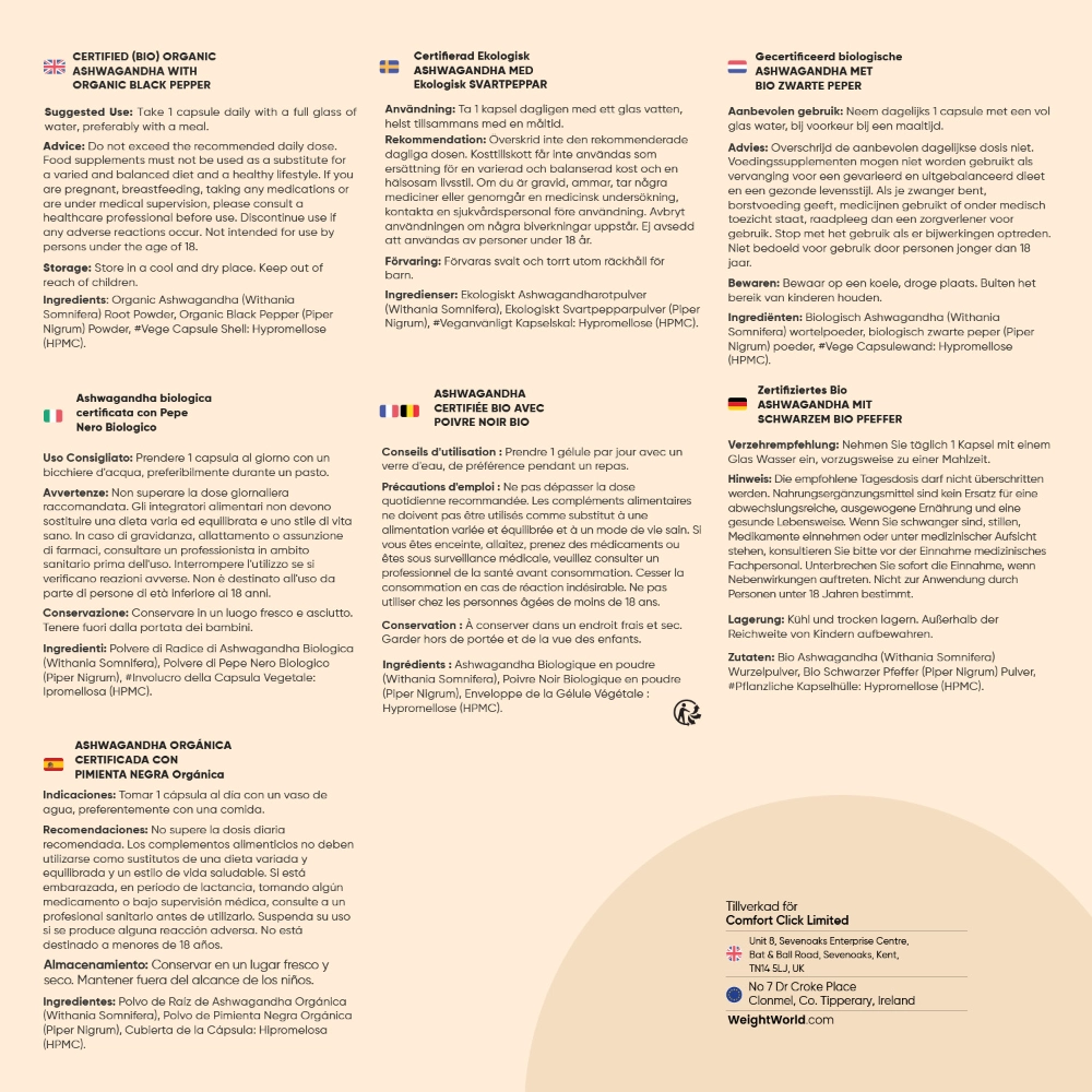 Dessa kapslar ger dig en utmärkt möjlighet att testa denna omtalade superfood på ett enkelt och naturligt sätt! Du får en hög dos på 600 mg ashwagandha per dag, och tillskottet är dessutom berikat med ekologiskt svartpepparpulver. En burk innehåller 180 kapslar och räcker till hela 6 månaders konsumtion, då du bara behöver ta 1 lättsvald kapsel per dag. Tillskottet är ekologiskt tillverkat, och är även veganvänligt, glutenfritt och GMO-fritt.
