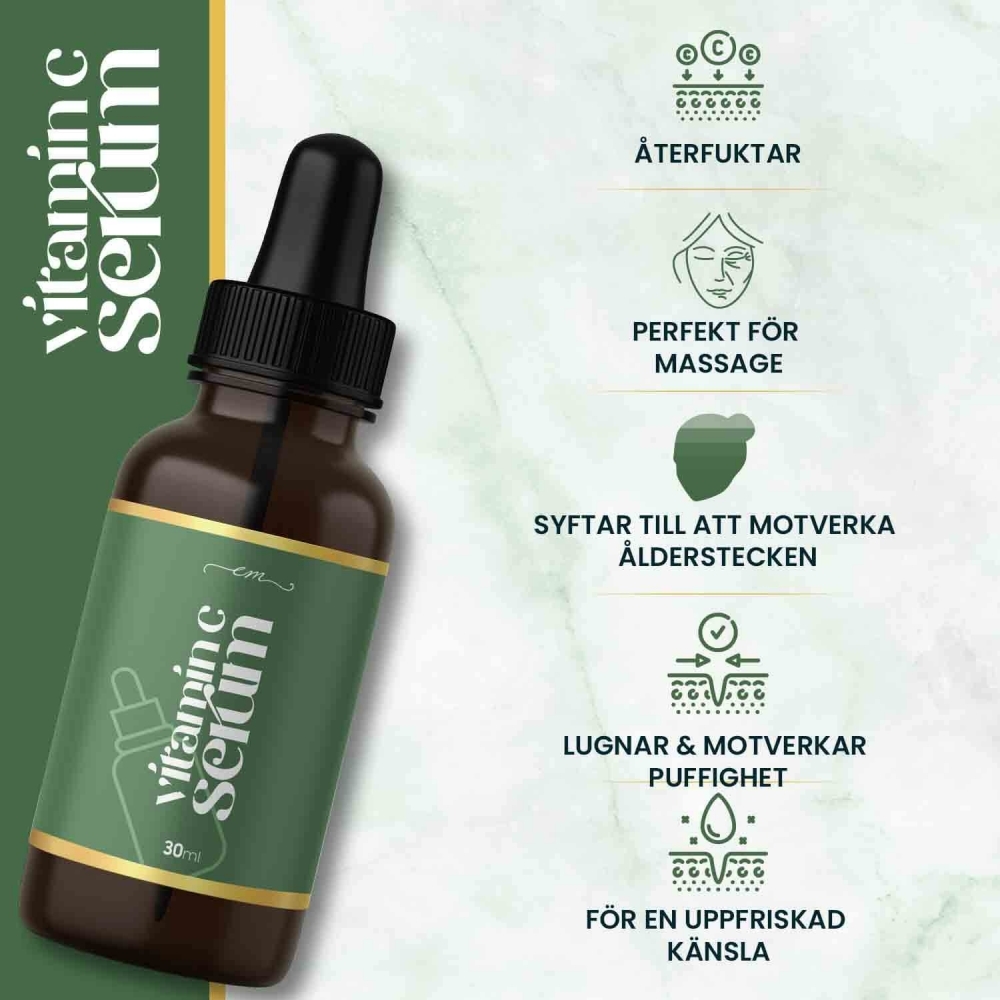 Efter rengöring och toner, applicera 5-10 droppar C-vitaminserum på ansiktet och massera försiktigt in med cirkulära rörelser.