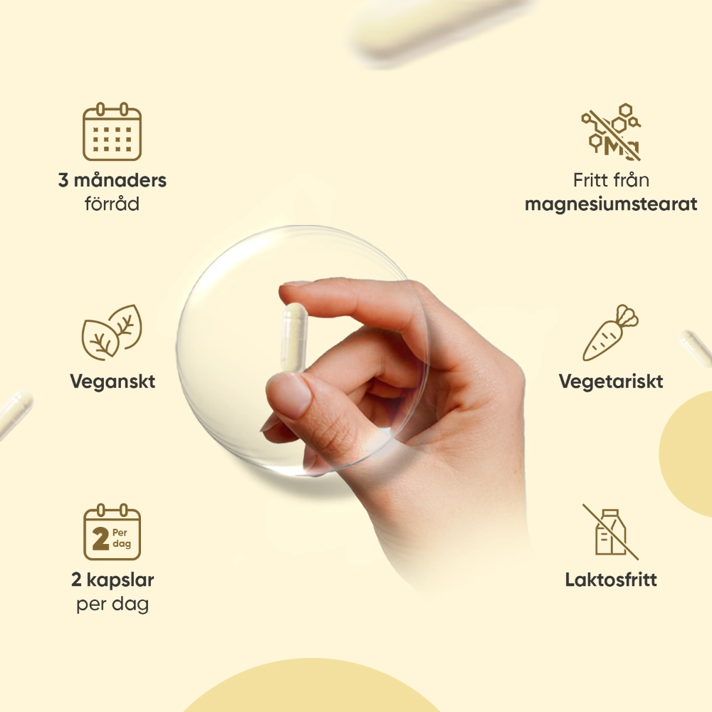 - Ta 2 kapslar dagligen - tillräckligt för 3 månaders förbrukning