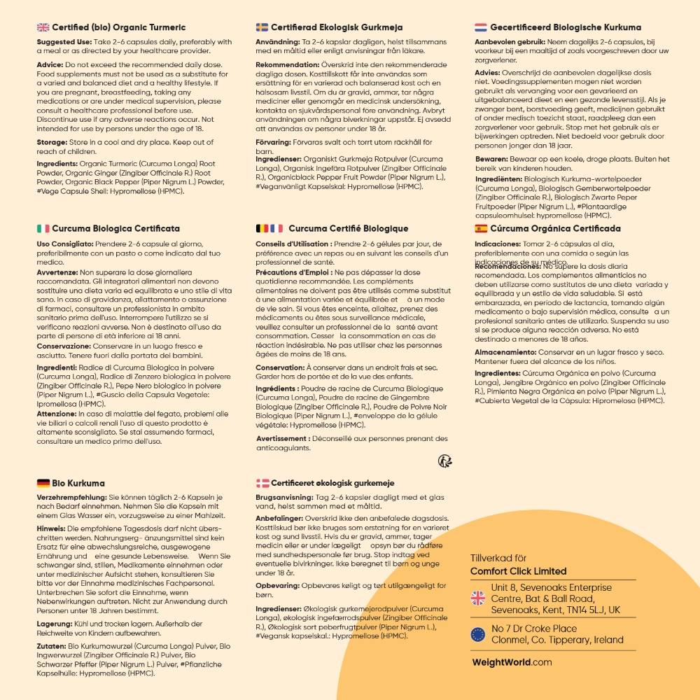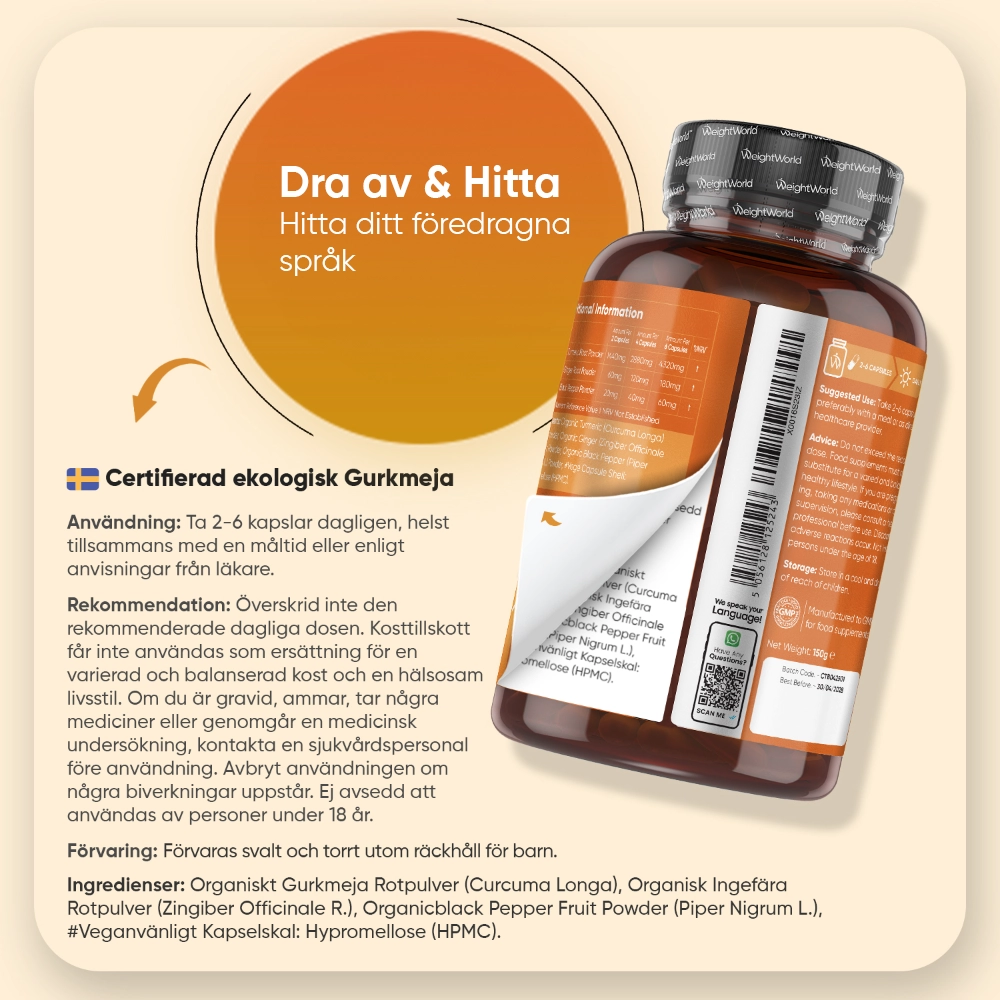 WeightWorlds Gurkmeja kapslar är ett 100 % ekologiskt kosttillskott berikat med ekologiskt svartpepparextrakt (piperin) och ekologisk ingefära för att förbättra upptaget av curcumin. Piperin används för att öka upptaget av tillskottet, så att du får ut det mesta av de viktigaste ingredienserna och kan skämma bort din kropp på bästa möjliga sätt. Våra gurkmeja kapslar är speciellt framtagna för lederna, matsmältning och hud.