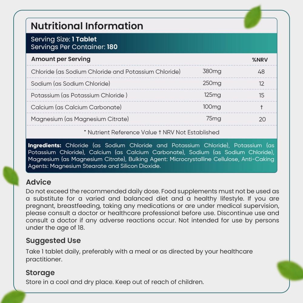 Kalium: Är nödvändigt för ett hälsosamt blodtryck, reglering av hjärtrytmen och för att ge kroppen nödvändigt stöd för vätskebalansen. Är också viktigt i förhållande till att bibehålla normal muskel- och nervfunktion och ett normalt blodtryck.