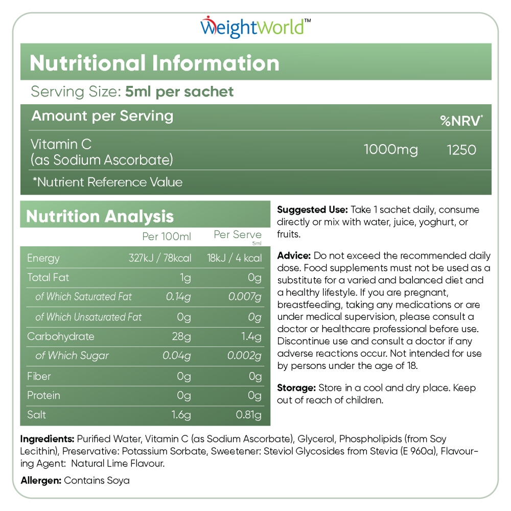 Öppna helt enkelt en påse och drick det flytande C-vitamintillskottet som det är, eller tillsätt det till juice, vatten, smoothies eller frukt för att ge ditt immunförsvar en naturlig boost med en hög daglig dos av hela 1000 mg liposomalt C-vitamin, vilket är känt att ha en hög biotillgänglighet och absorberas lätt av kroppen.