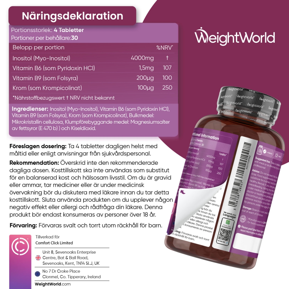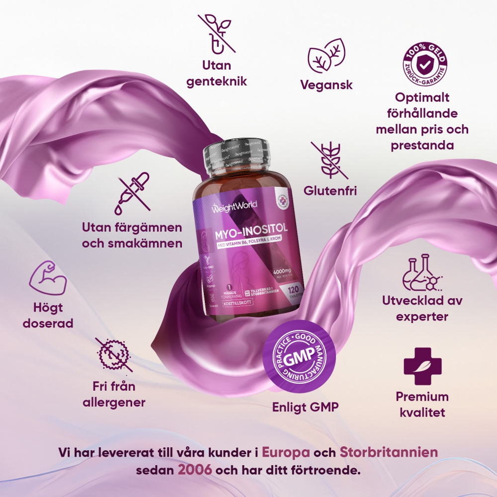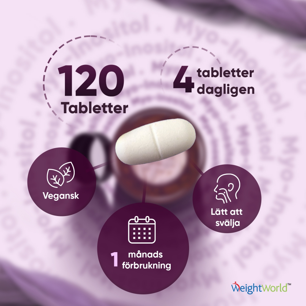 På WeightWorld har vi gjort det enkelt för dig att njuta av de många fördelarna med inositol, eftersom du med våra Inositol-tabletter kan njuta av en hög daglig dos på 4000 mg myo-inositol genom att bara ta 4 tabletter.