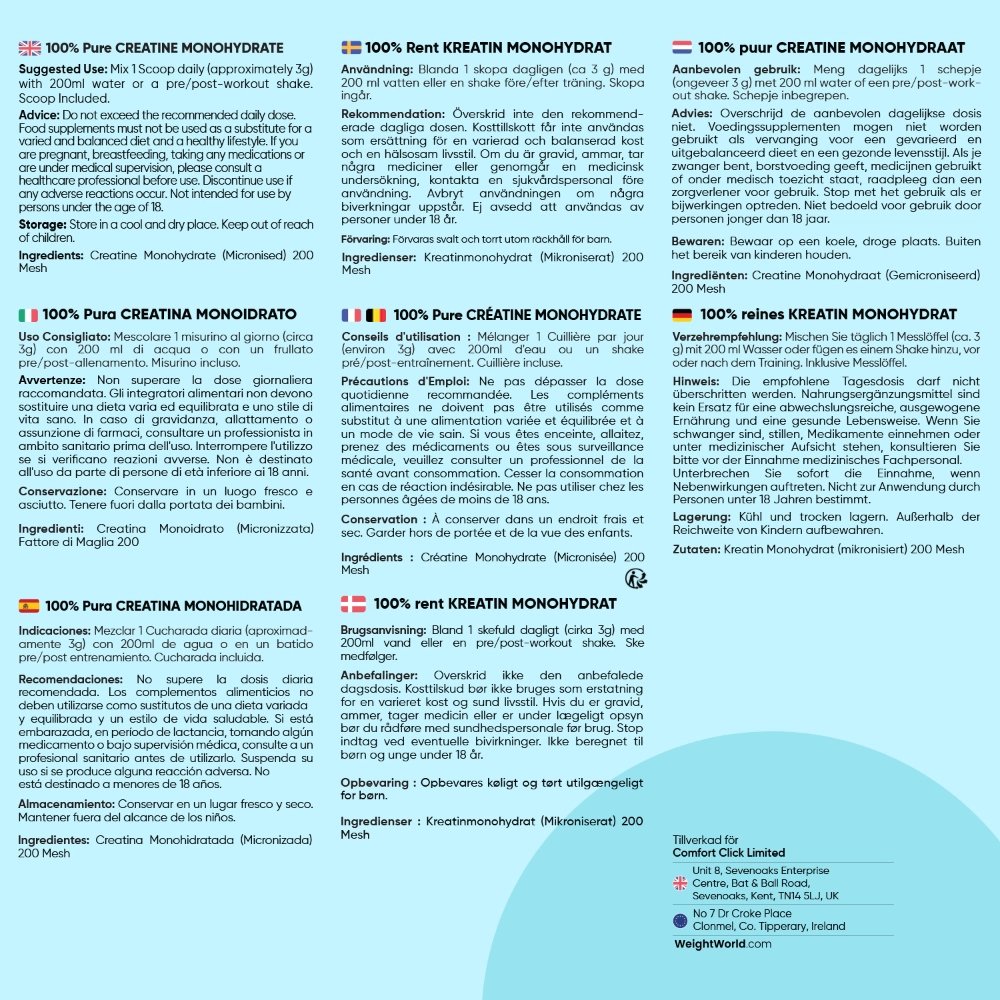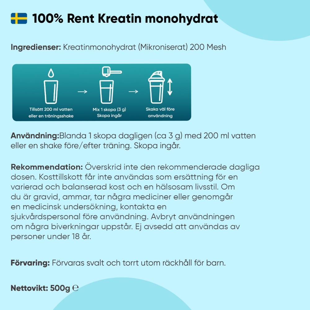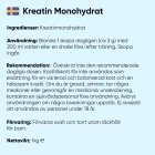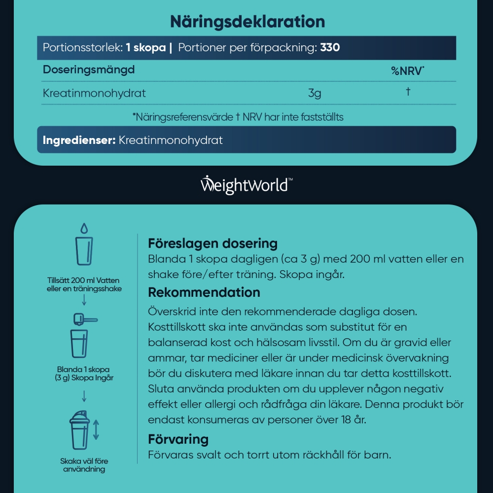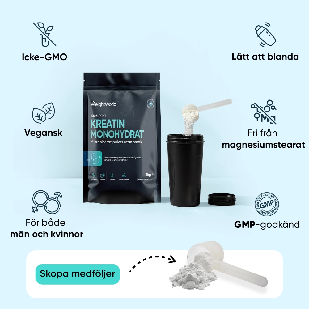 Med detta pulver får du ett rent och högpotent kreatintillskott, utan onödiga tillsatser. Pulvret är utan smak och lätt att blanda med vatten eller shakes. Vi rekommenderar att du tar 3 g kreatinpulver per dag före eller efter träningen. Med den medföljande måttskopan kan du dessutom enkelt och smidigt mäta upp rätt mängd. WeightWorlds Rent Kreatinpulver är veganvänligt, glutenfritt och GMO-fritt.