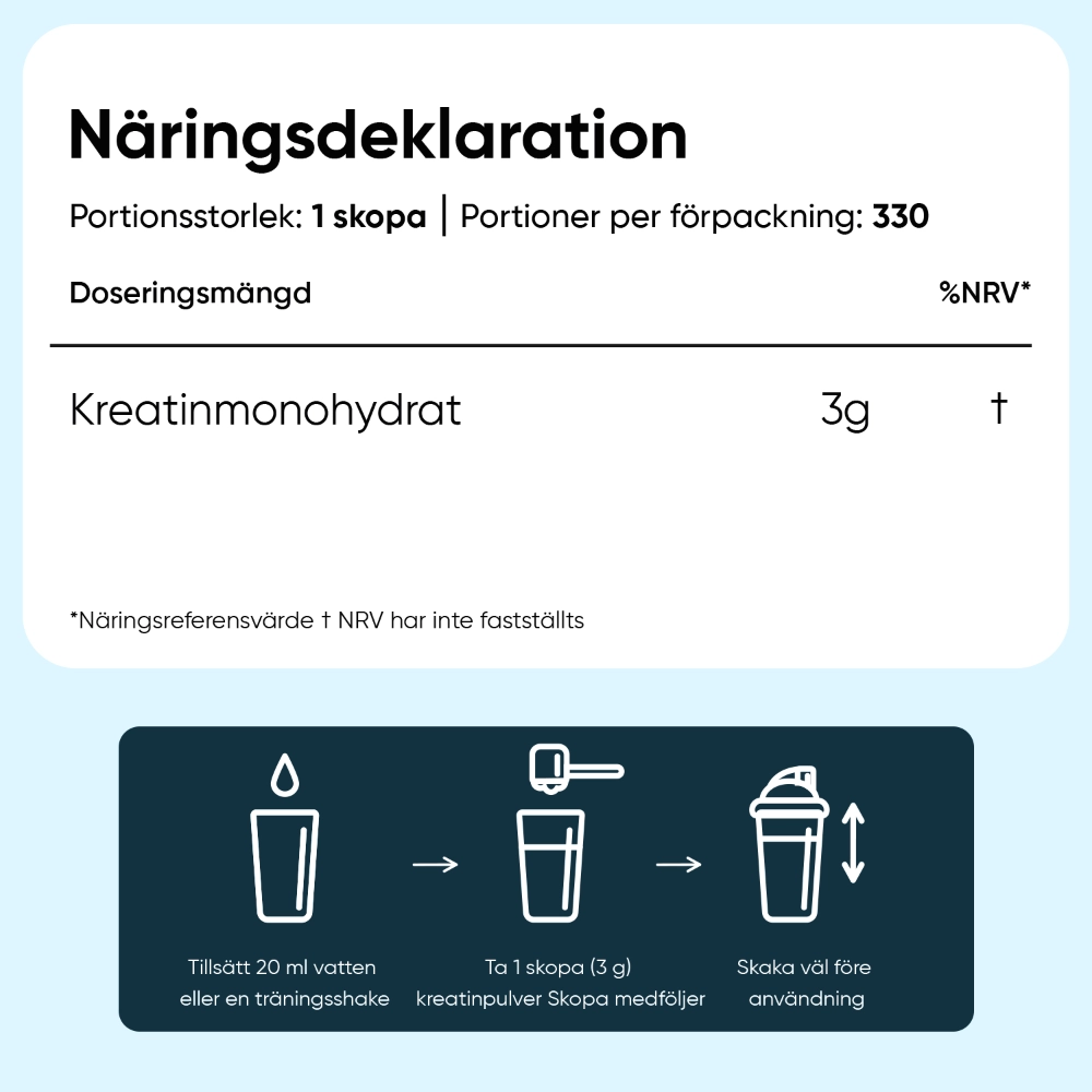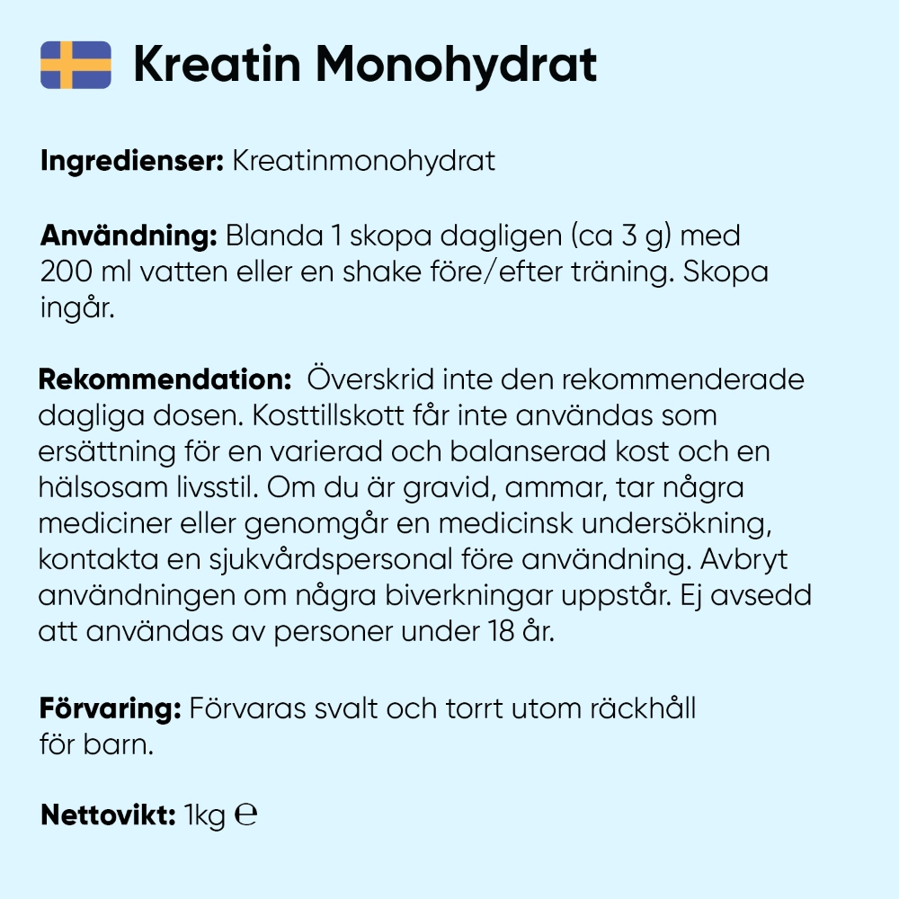 Kreatin är ett ämne som finns naturligt i vår muskelmassa. Vid explosiv muskelanvändning omvandlas kreatin till kreatinfosfat för att ge oss mer energi. Därför kan kreatin öka den fysiska prestationsförmågan vid upprepade perioder av kortvarig, högintensiv träning (vid ett dagligt intag av 3 gram kreatin). Av den anledningen används kreatin ofta vid exempelvis styrketräning och bodybuilding. Detta pulver består av kreatinmonohydrat, som är den vanligaste formen av kreatin i kosttillskott.