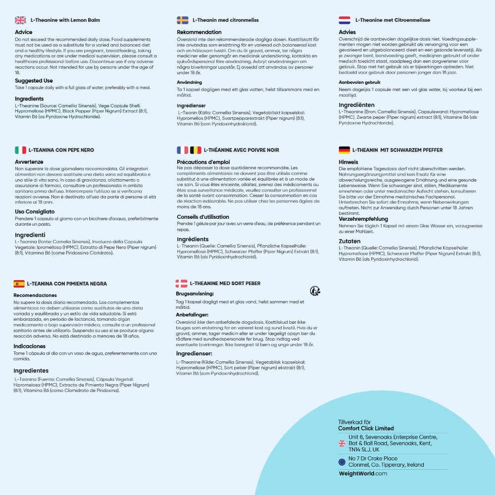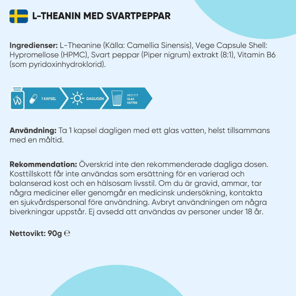 Detta tillskott ger en hög daglig dos på 400 mg L-theanine. Det är även berikat med 8 mg svartpeppar för att öka biotillgängligheten, samt 0.5 mg vitamin B6.