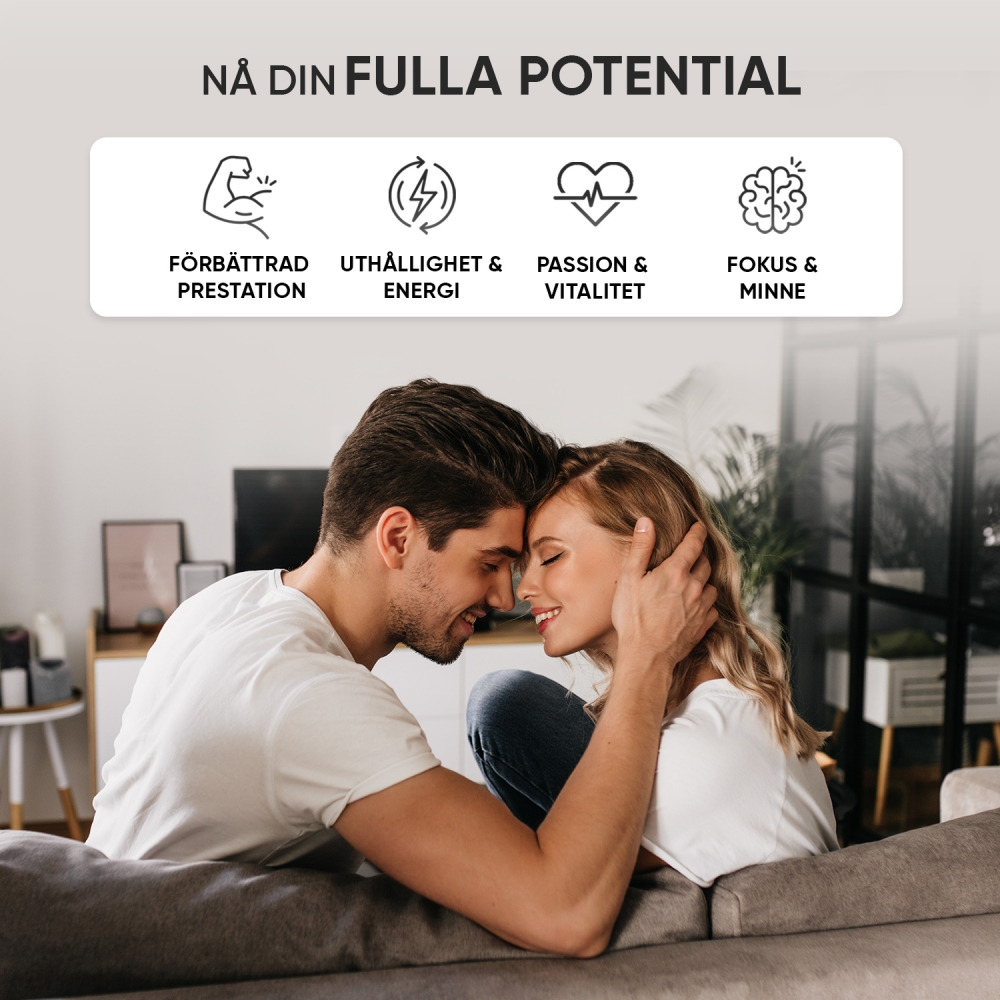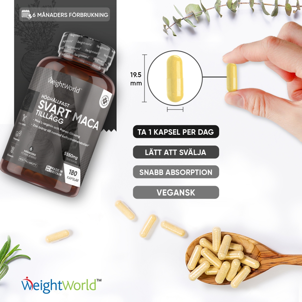 - Med både gul och svart maca för 5000 mg per dag