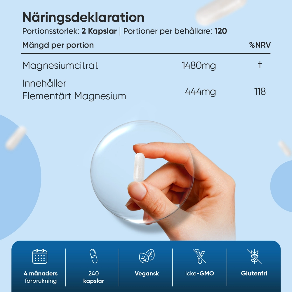 Det är precis därför vi här på WeightWorld har skapat Magnesiumcitrat 444 mg, så att du på ett enkelt sätt kan njuta av alla fördelar med magnesium. En burk innehåller 240 kapslar och räcker i hela 4 månader. Tillskottet är dessutom veganvänligt, glutenfritt och GMO-fritt.