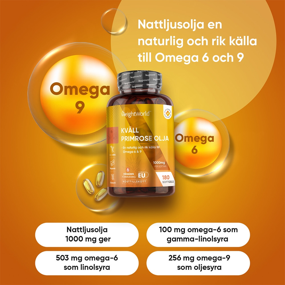 Nattljusolja är en fantastisk källa till omega-6-fettsyran gamma-linolensyra, ofta förkortat GLA. Det är en så kallad essentiell fettsyra, som antingen måste tillföras via kosten eller kosttillskott, eftersom kroppen inte klarar av att producera den själv.