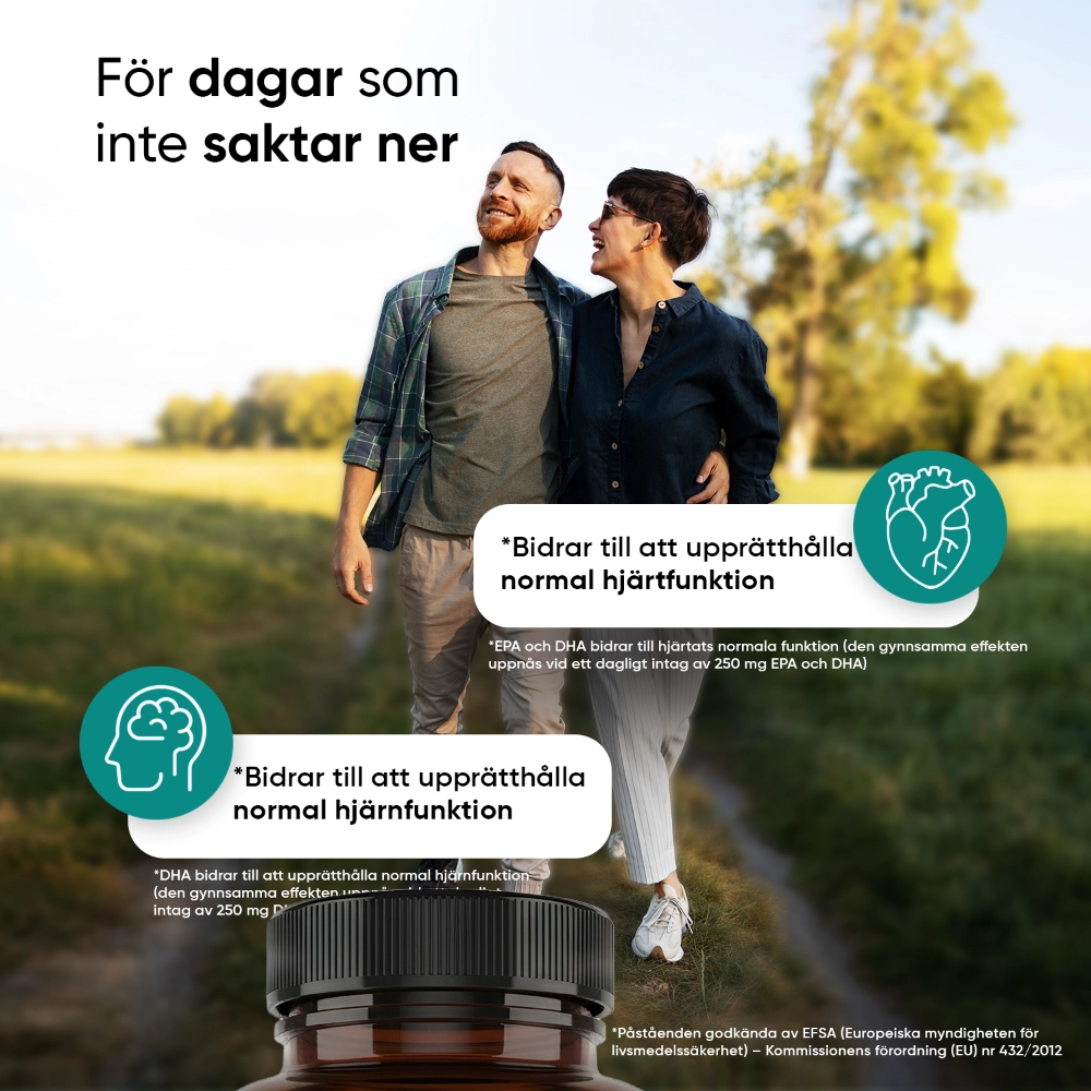 - DHA och EPA bidrar till normal hjärtfunktion (vid ett dagligt intag av 250 mg).