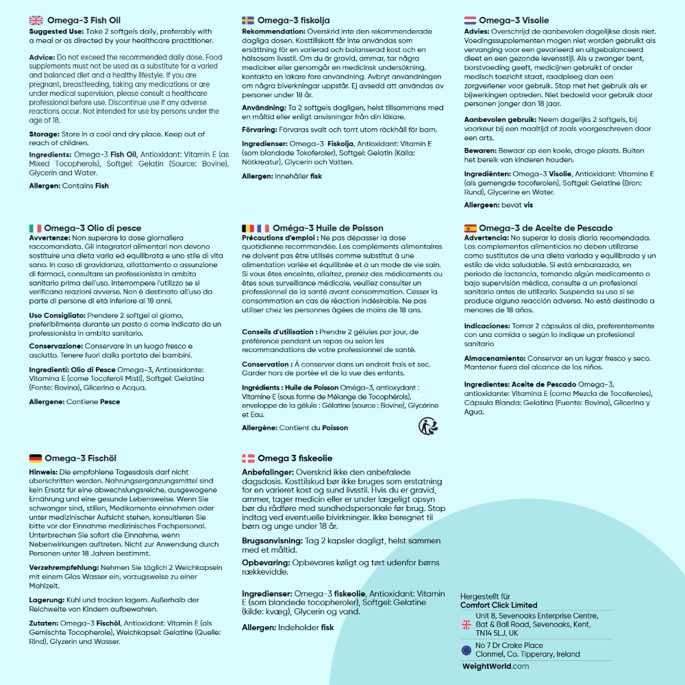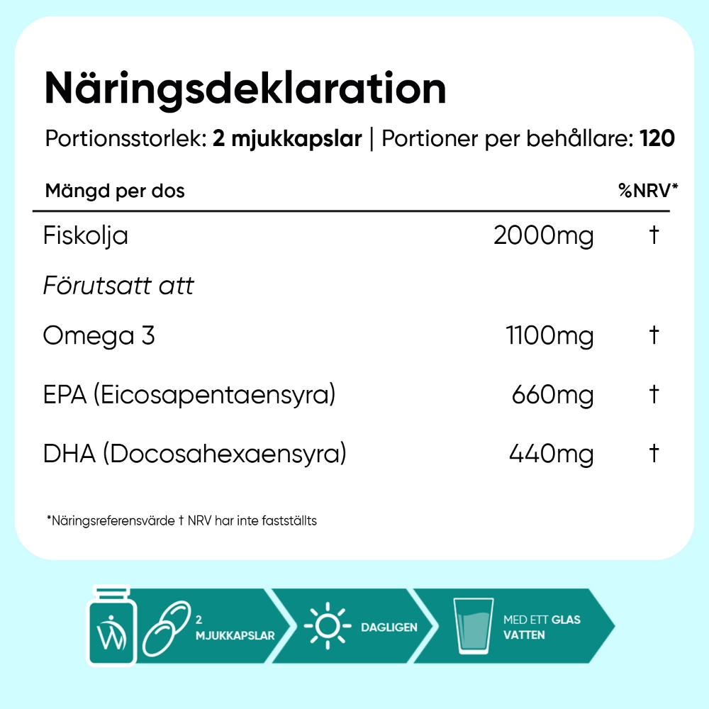 WeightWorlds Omega 3 Fiskolja 2000 mg erbjuder ett smidigt sätt att få i sig viktiga fettsyror. Den dagliga dosen levererar hela 660 mg EPA och 440 mg DHA, genom att du bara behöver ta 2 lättsvalda kapslar. En burk räcker till hela 4 månaders förbrukning, och tillskottet är dessutom glutenfritt, laktosfritt och GMO-fritt.