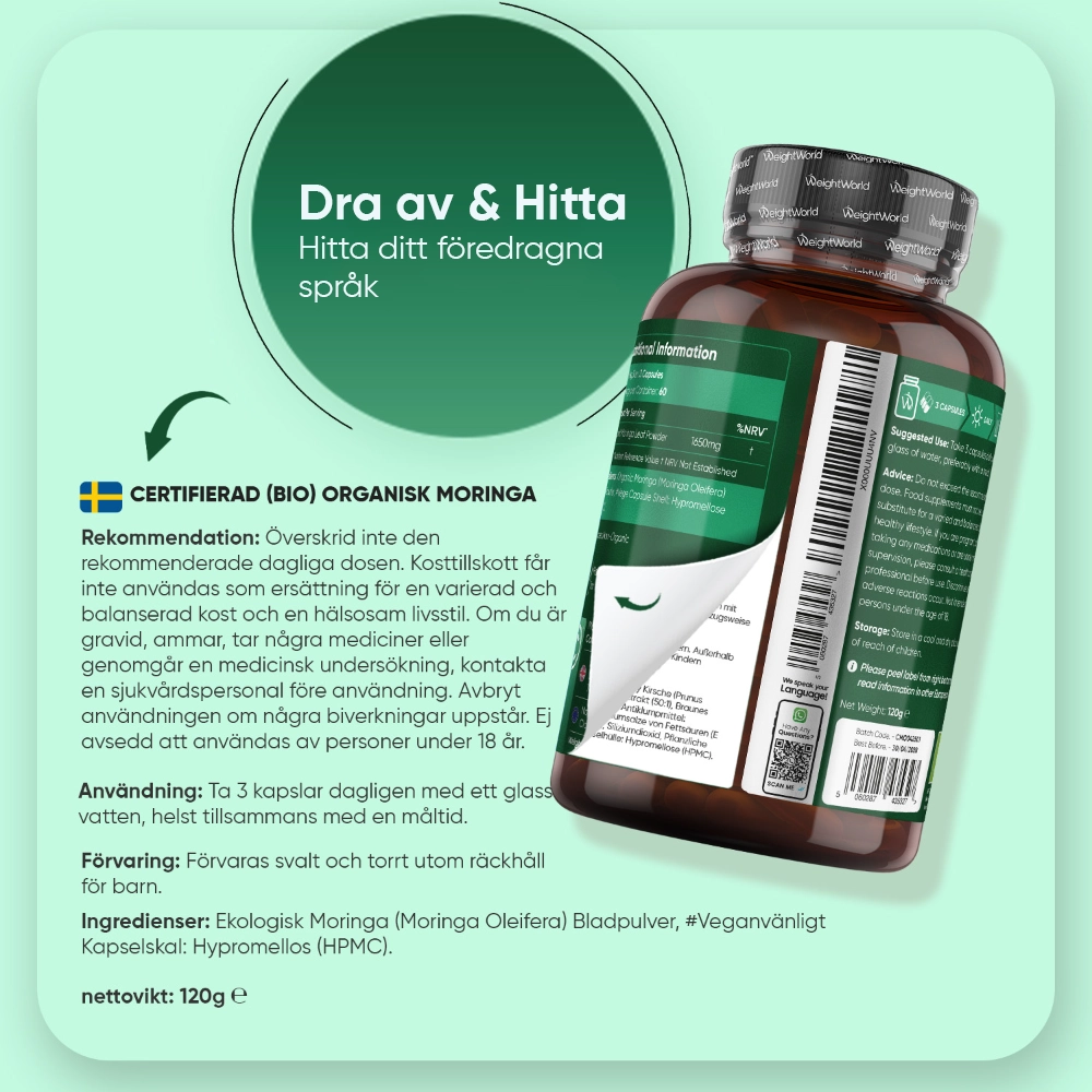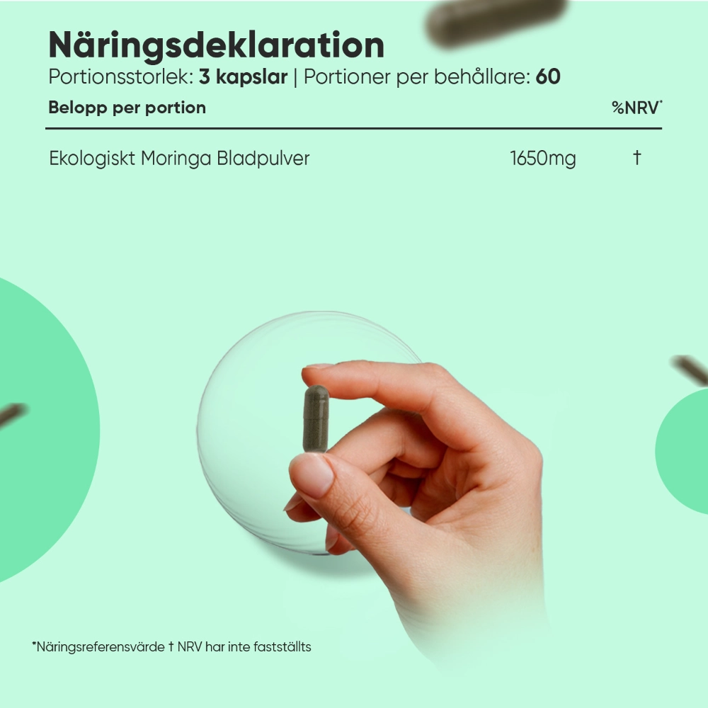 - Hög daglig dos på 1650 mg moringa