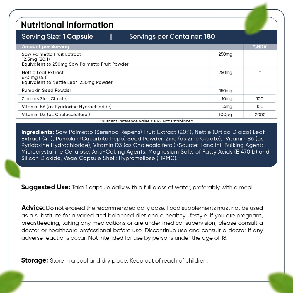 - Med sågpalmetto, zink, vitamin B6 och D3