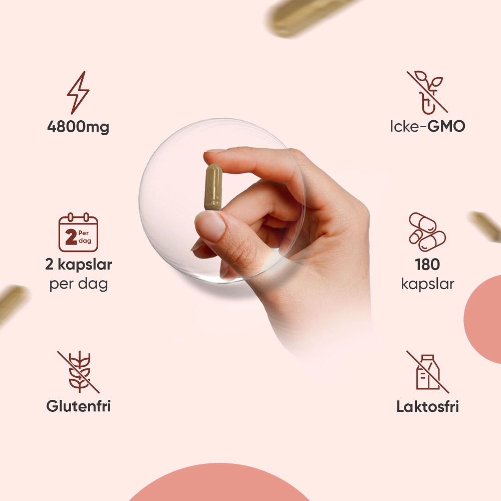 - 180 kapslar - tillräckligt för 3 månaders konsumtion