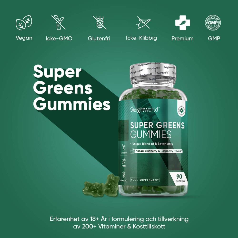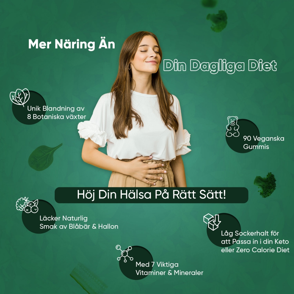 Våra Superfood Vitamin Gummies smakar ljuvligt av blåbär och hallon, och innehåller en kombination av 8 noga utvalda superfoods som kronärtskocka, moringa, chlorella, broccoli, korngräs, persilja, spenat och selleri. Dessa näringsrika grönsaker är kända för att bidra till bland annat: