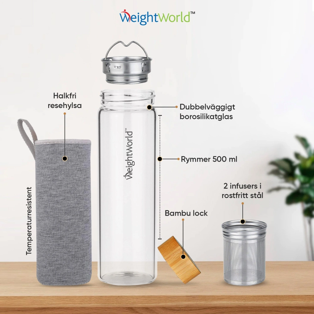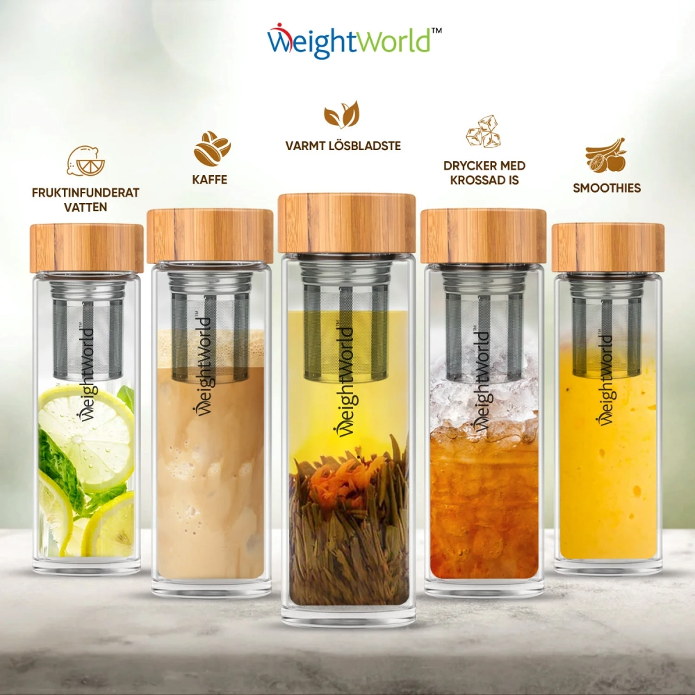 WeightWorld te Infuser Bottle är gjord av förstklassiga material och den är perfekt för att hålla temperaturen för både varma och kalla teer och kan användas till vilken typ du vill, med tepåse eller lösa blad. Du behöver aldrig mer bära med dig en opålitlig mugg eller spilla din dryck; denna flaska är krångelfri och gör det möjligt för dig att ta med dig utsökta ört- eller frukter utan problem!