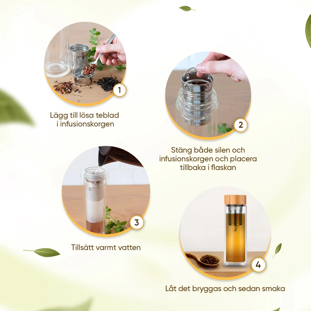 Välj först vilket sorts te du skulle vilja tillreda, antingen med tepåse eller lösa blad. När du väl valt ska du skruva av locket och tillsätta det till filtret på toppen av flaskan, för en lättare smak. Tillsätt nästan kokande vatten och låt dra. Tiden för detta beror på teet som används och personlig smakpreferens. Ta sedan bort filtret och det är redo att drickas. För en starkare smak, lägg tebladen direkt i flaskan och låt silen vara kvar under tiden du dricker. Du kan även twista till det lite och tillsätta dina frukter och extra tillägg du gillar, såsom citron, honung eller jordgubbar. Topptips – denna Termosflaska med Te Silar fungerar perfekt med WeightWorld sortiment av teer!