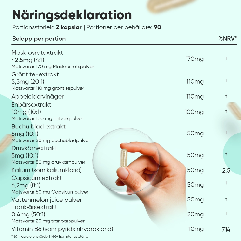 Water Away-kapslar innehåller totalt 11 naturliga ingredienser. Bland dessa finns vitamin B6 och kalium: