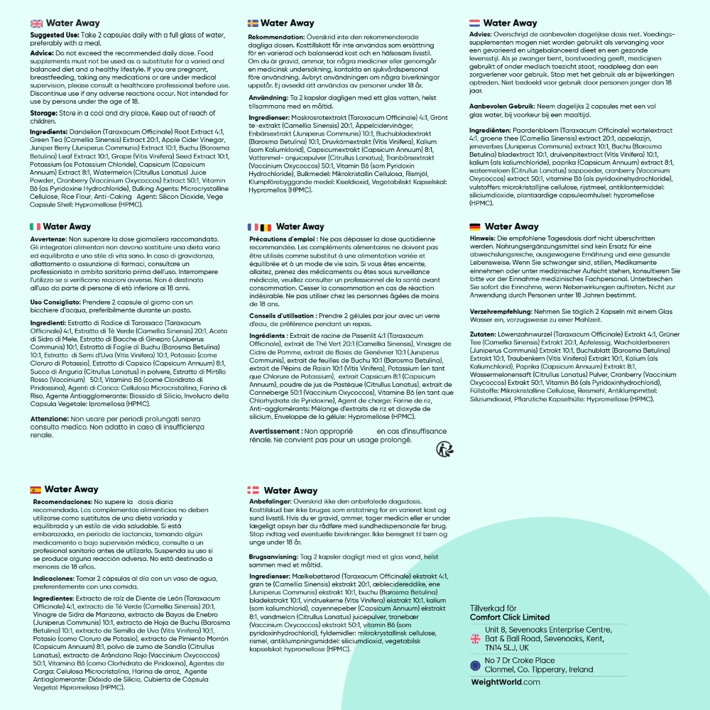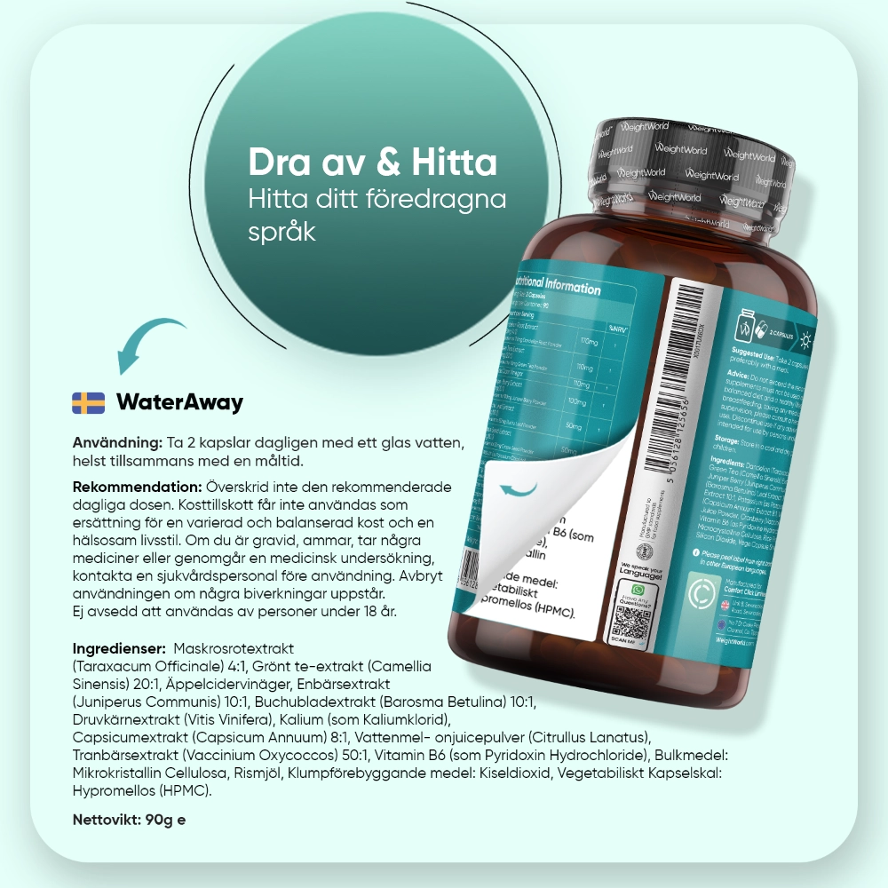 Water Away är helt vegansk, glutenfri och producerad under strikta standarder. Med 180 kapslar per förpackning har du tillräckligt för 3 månaders användning.