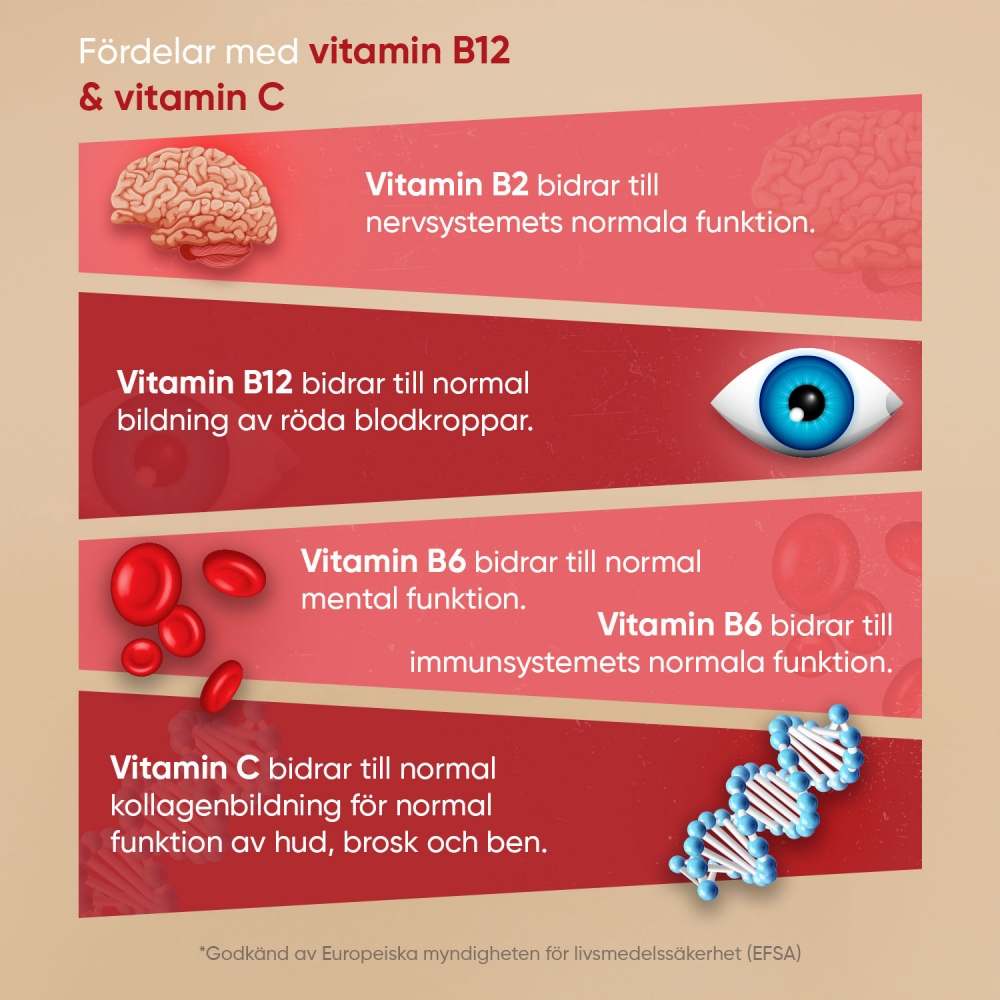 - Riboflavin (vitamin B2), Niacin (vitamin B3), vitamin B6 och B12 bidrar till att minska trötthet och utmattning.