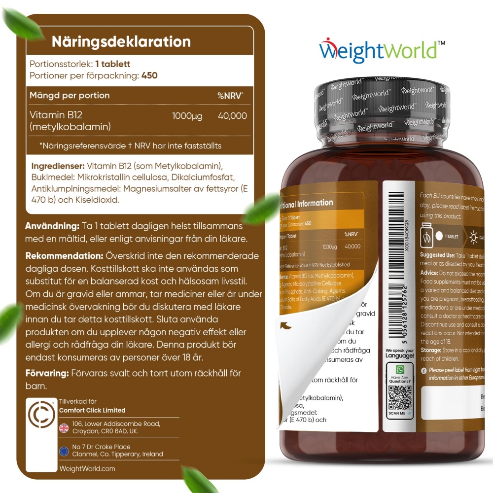 WeightWorlds Vitamin B12 är ett naturligt tillskott med ett essentiellt vitamin som bidrar till immunförsvarets normala funktion och energiomsättning, samt hjälper till att minska trötthet och utmattning. Dessutom spelar vitamin B12 också en viktig roll i bildandet av röda blodkroppar och är avgörande för nervsystemets normala funktion.