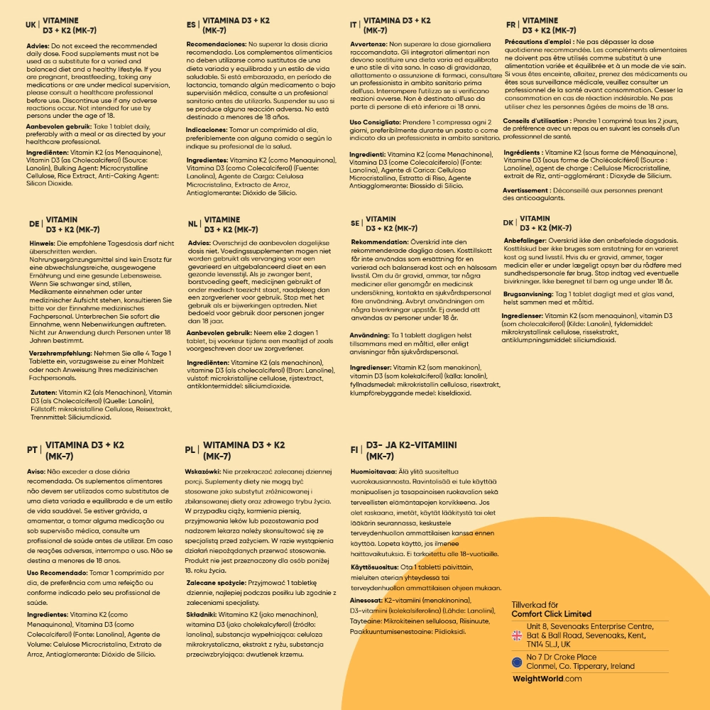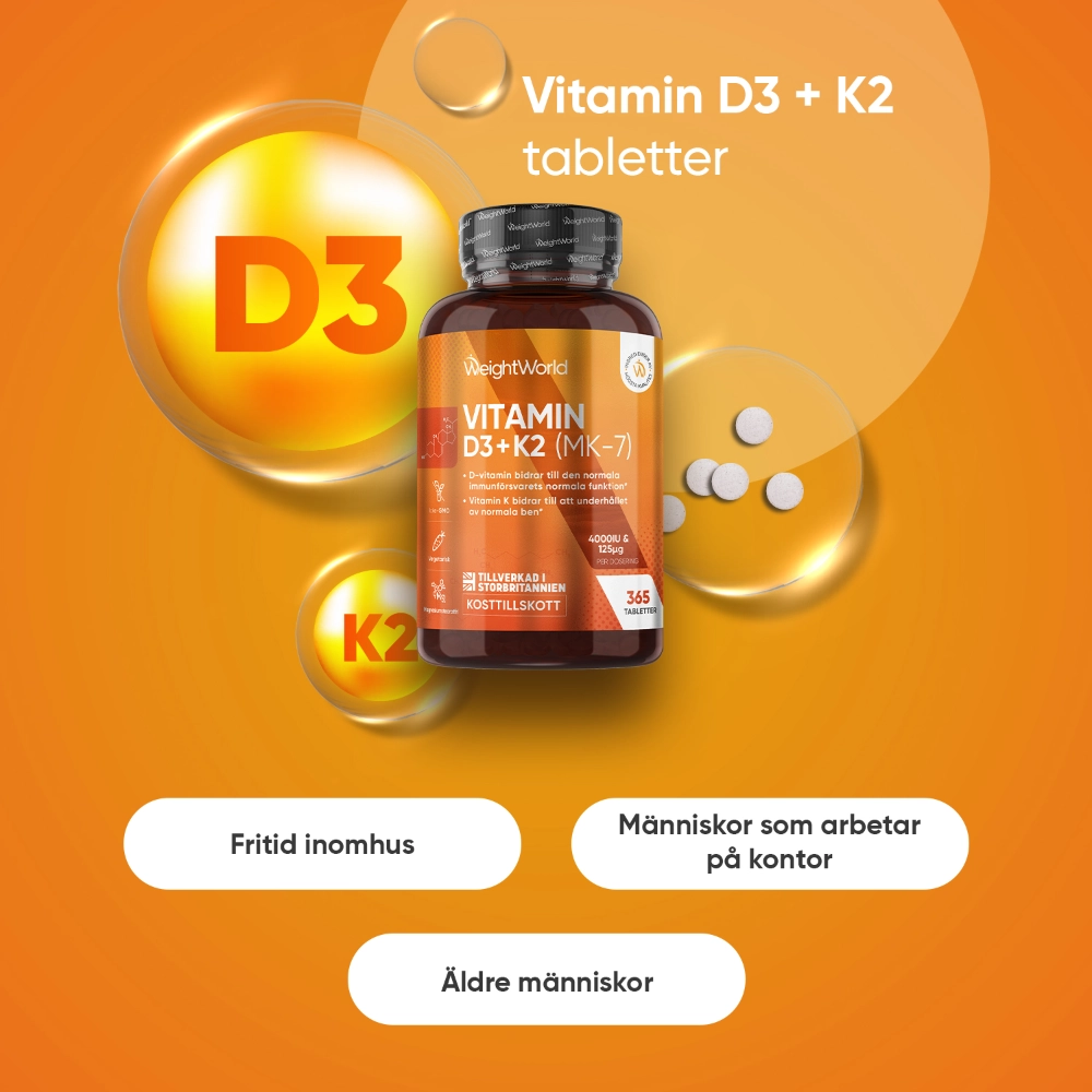 WeightWorlds Vitman D3 + K2 är en genomtänkt kombination av två viktiga vitaminer i en smidig daglig tablett. Varje burk ger 1 års förbrukning så att du kan få ett dagligt stöd för immunsystemet, benstommen, muskelfunktionen och mer. Detta även med en 100% nöjdhetsgaranti, vilket gör det utmärkt för dig som önskar att ha det.